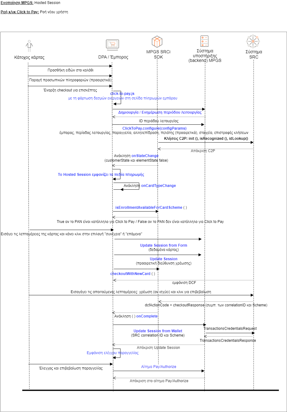 Οι παρακάτω εικόνες απεικονίζουν τις ροές που σχετίζονται με τα τρία σενάρια. Για περισσότερες πληροφορίες σχετικά με τον τρόπο υλοποίησής τους, βλ. Ενοποίηση Hosted Session του Click to Pay.